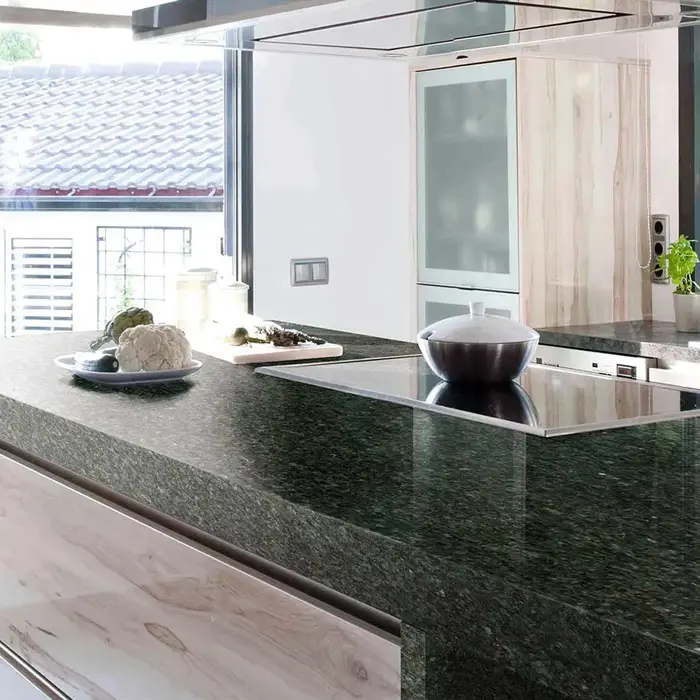 El Granito Verde Ubatuba de brillo iridiscente, presenta una superficie homogénea y oscura con incrustaciones de cuarzo amarillo que relucen bajo la luz. Su tono verde profundo lo convierte en un material elegante y perfecto para crear ambientes exclusivos.